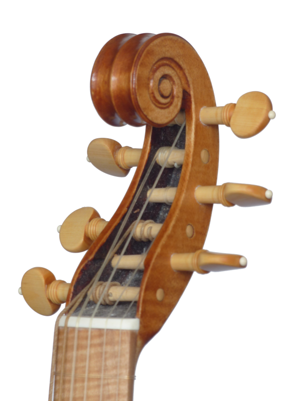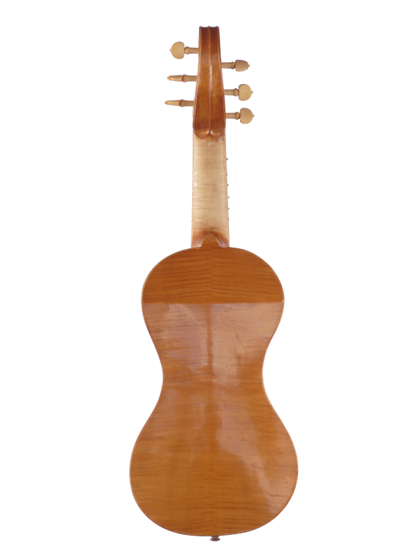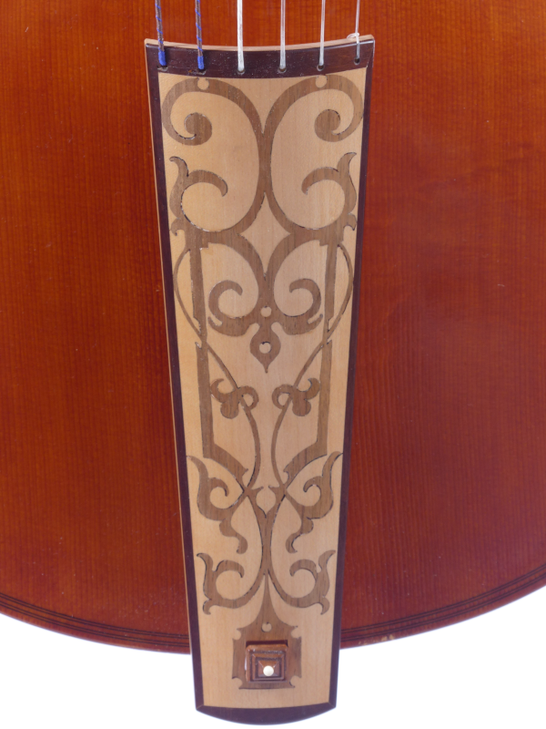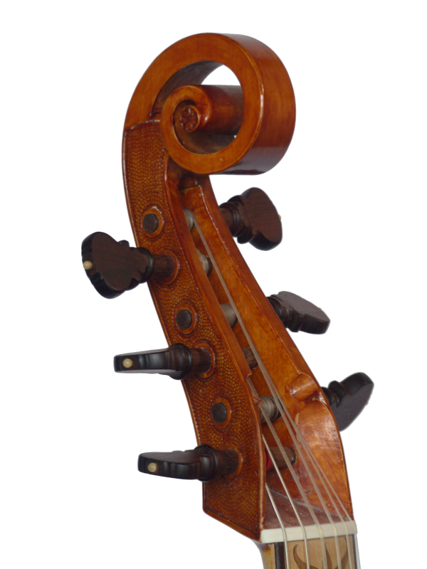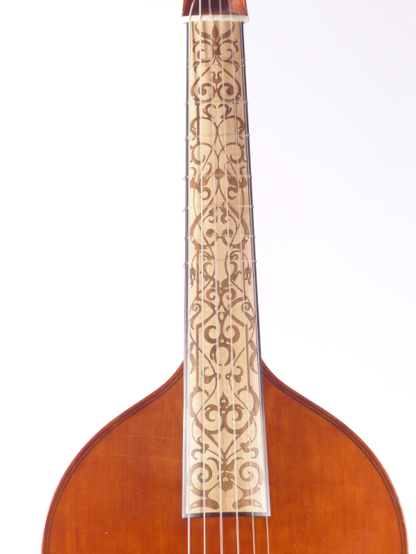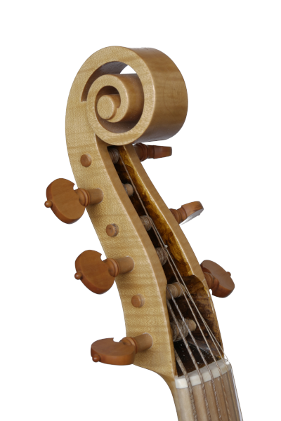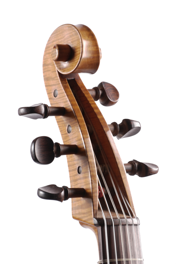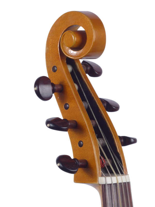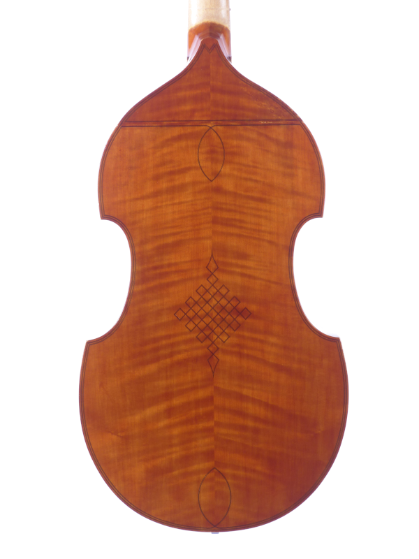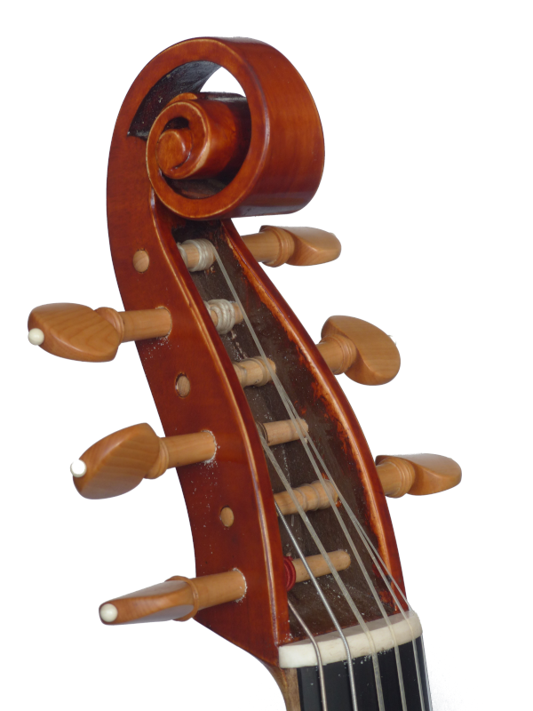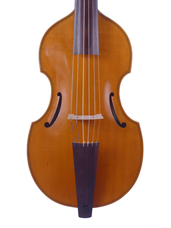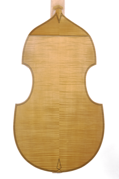 Im Besitz des Pariser Instrumentenmuseums befindet sich neben einer Pardessus- und einer siebensaitigen Basse de viole auch eine Dessus de viole von Nicolas Bertrand von 1721, die jedoch nicht in der Ausstellung zu sehen ist. Vor etlichen Jahren (als das Museum noch zum Conservatoire gehörte) hatte ich die Gelegenheit einige Fotos und Maße dieses Instruments abzunehmen. Auffällig war mir die geringe Größe des Instruments mit 358 mm Korpuslänge. In den 1990er Jahren habe ich dieses Modell öfter als Grundlage für meine Diskantgamben verwendet bevor ich dann zu einem Barak Norman Modell gewechselt bin. 2021 habe ich interessehalber das Bertrandmodell noch einmal aufgegriffen.